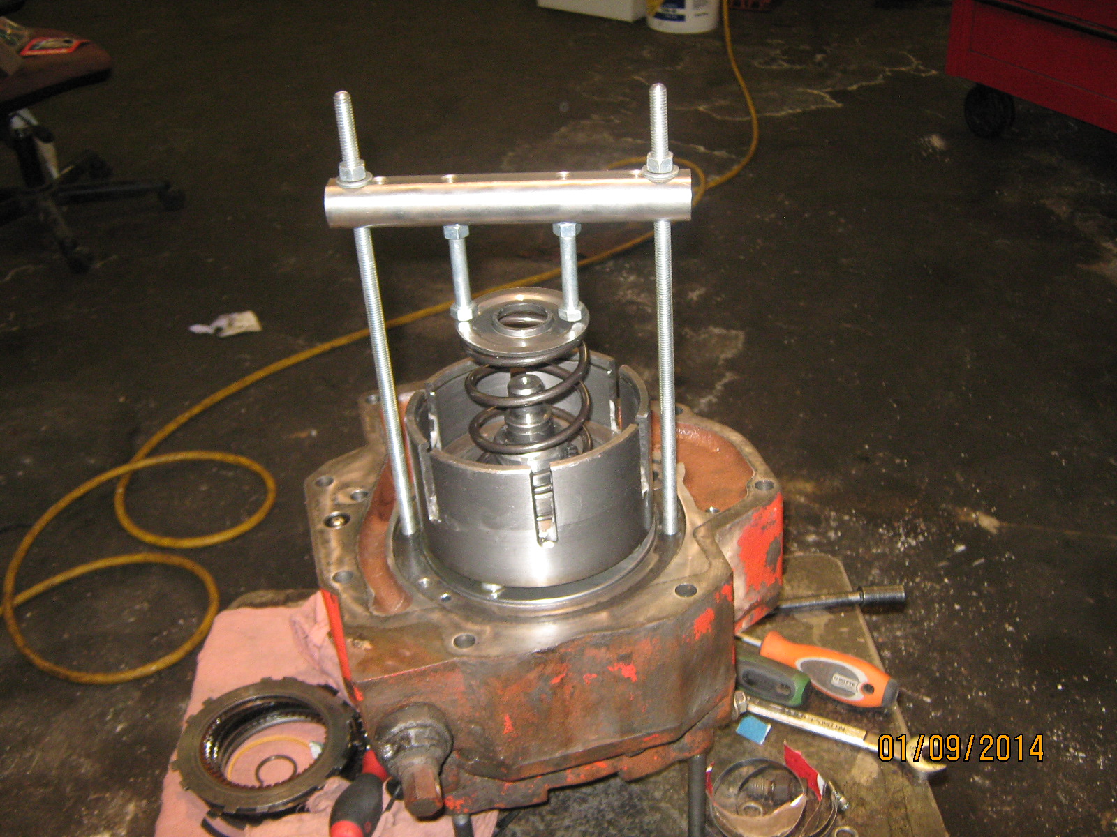 To continue disassembly, the large spring in the center of the clutch carrier needs to be compressed enough to remove the snap ring. This may be done in a press, or by making a simple tool, or you can purchase the PTO Clutch Tool.