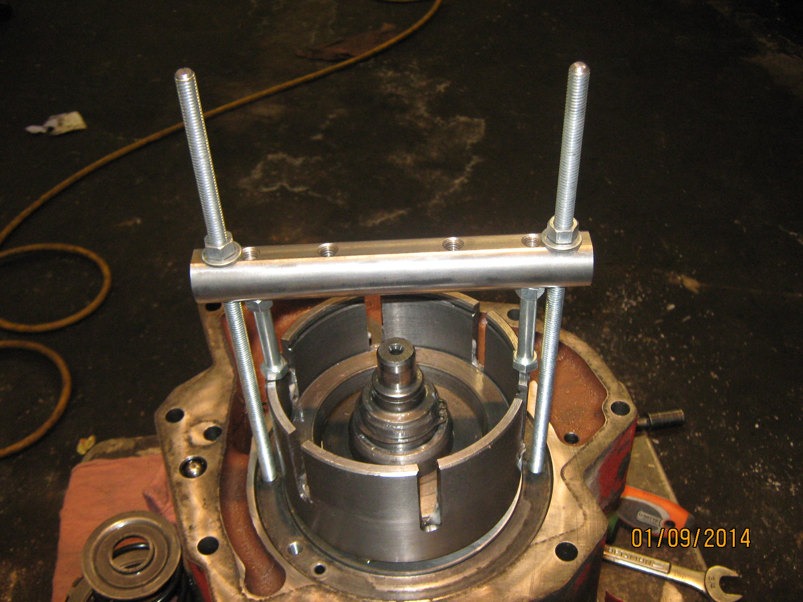 With piston removed, the next step is to compress the brake piston springs that are pushing the clutch carrier up...